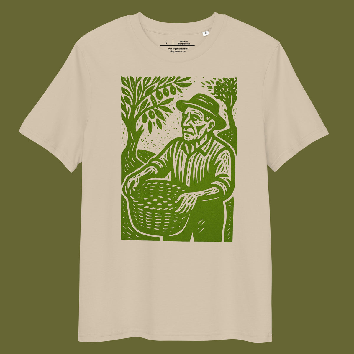 Organic cotton t-shirt with olive harvest farmer in olive-green linoprint style. Sustainable fashion made in Portugal for nature and tradition lovers.